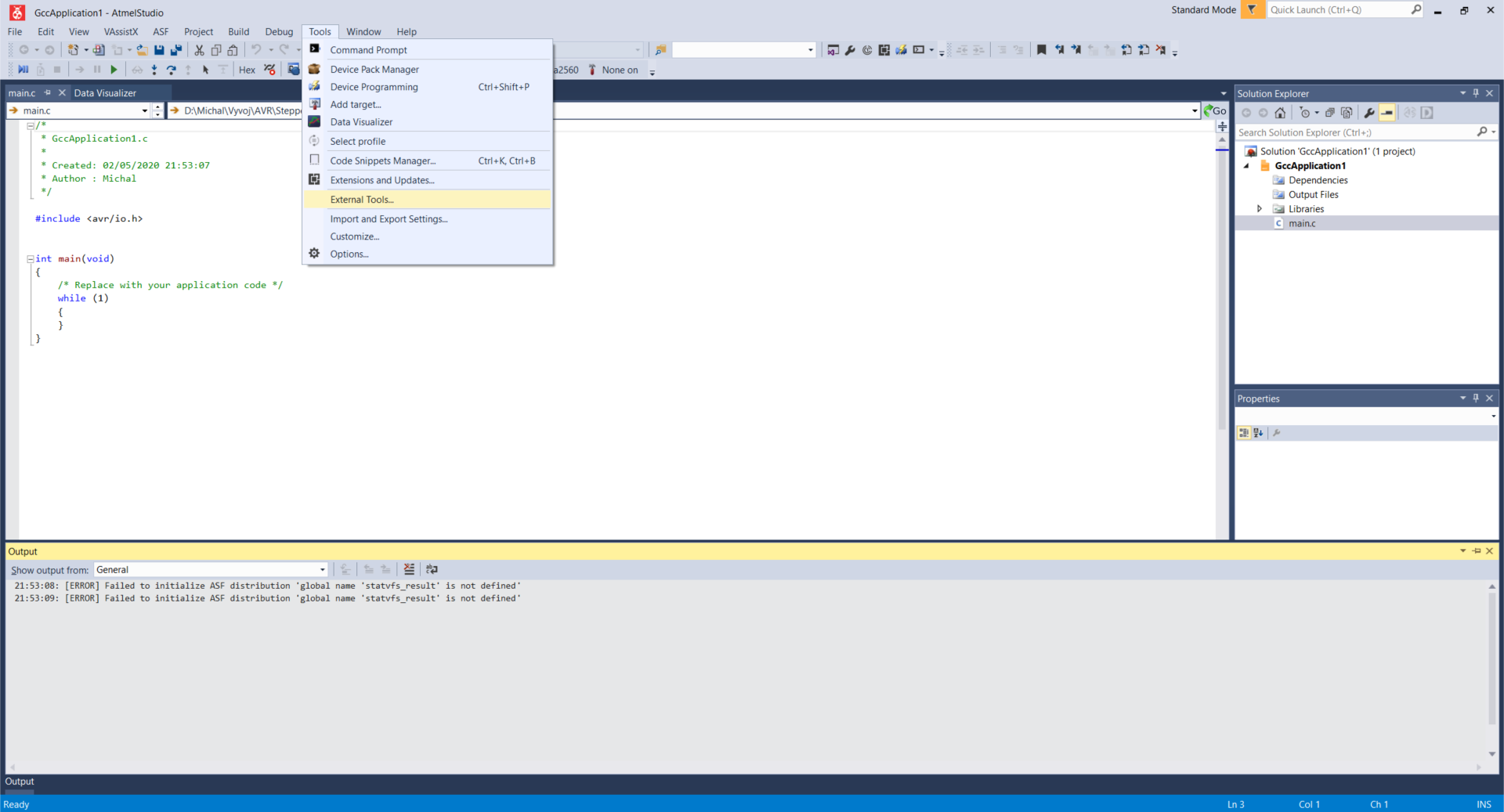 4. Open Atmel Studio and click on Tools -> External Tools as shown in the screenshot.