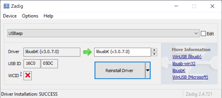 2. Install libusbK driver using Zadig software as presented in the following picture. (If you cannot see USBasp device you might need to click on Options -> List All Devices.)