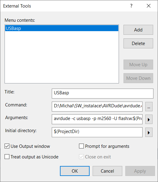 This short article presents my setup of Atmel Studio 7 for USBasp programmer. USBasp is a simple low-cost programmer that does not offer any advanced features such as on-chip debugging. On the other hand, the cost of this programmer is significantly lower in comparison with Atmel-supplied debuggers such as Atmel-ICE. USBasp can be added into Atmel Studio as an external tool. The following steps present the installation process.