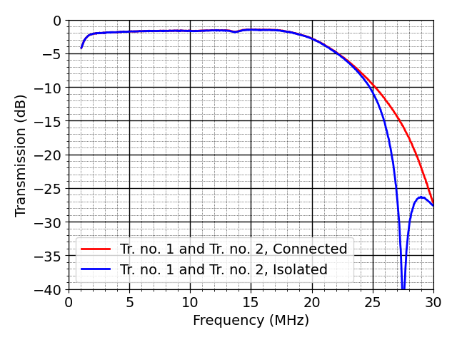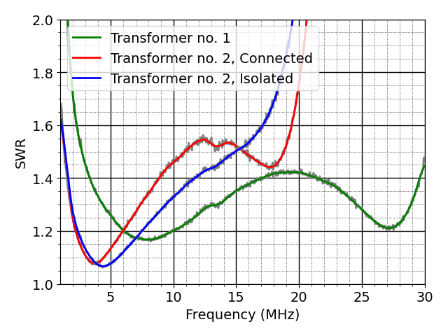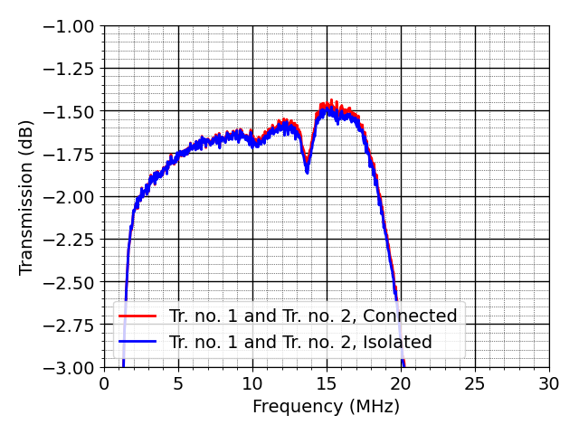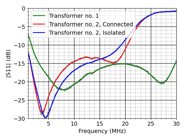 Furthermore, the transformers were connected back to back and transmission (S21) was measured. As the transformers were not identical, the results are only informative. On the other hand, they had overlapping bands, so one can get the idea of the losses.