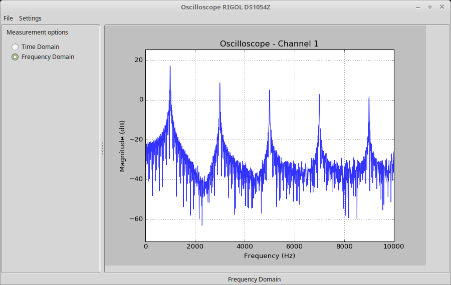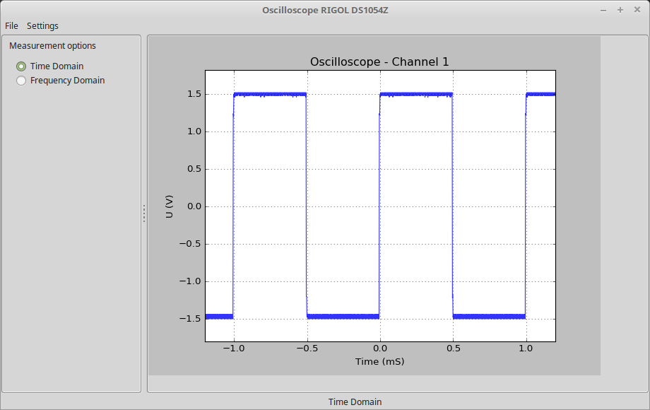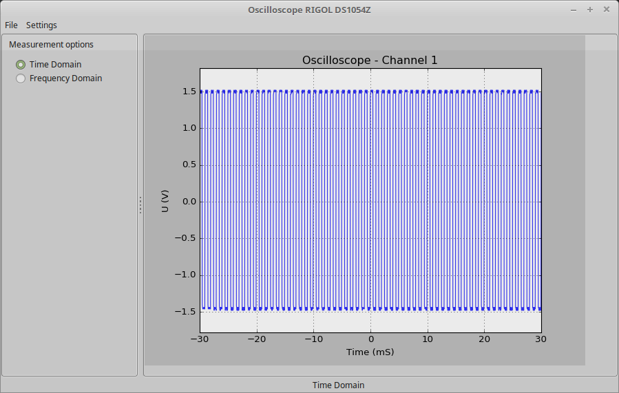 I have written a piece of code in Python for my oscilloscope Rigol DS1054Z. It allows me to read measured data in time domain, save them or convert them to frequency domain. For the communication with the oscilloscope I use LXI (LAN eXtensions for Instrumentation) bus which uses Ethernet interface and therefore the communication with the device is very comfortable. I see the main advantage of this software mainly in saving my measured data as it is far more user-friendly in comparison with USB memory stick. Secondly, in my opinion, it is easier to read FFT data in my application than on the oscilloscope. I have used multi-threading so the application is fully responsive even though the application read and present the data continuously, the graphs are automatically centered based on the received data and of course, the axis labels change automatically as well. I hope I will have time to add more functions in the future. Take a look at the following pictures.