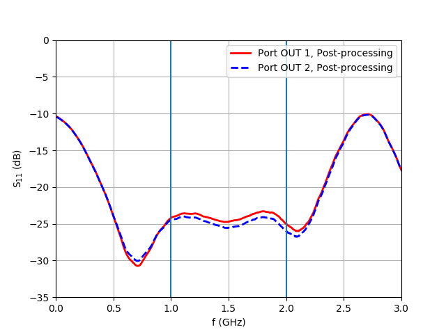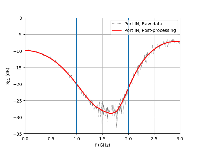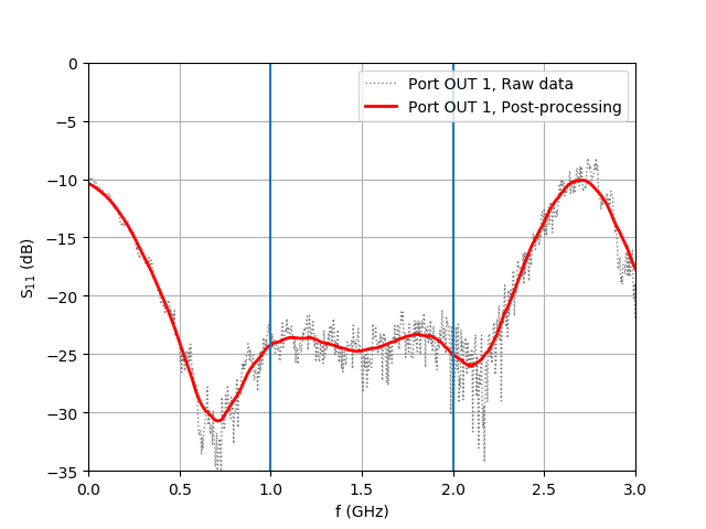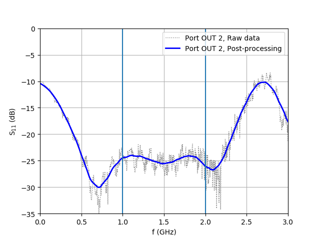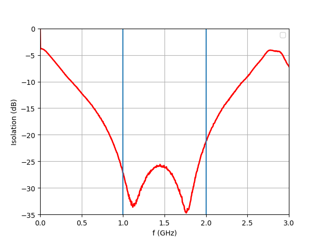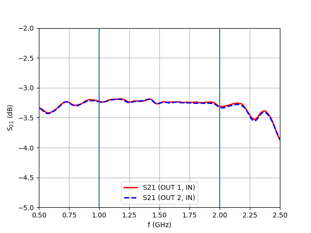 S11 and S21 measurements of a power divider (Narda 1-2 GHz, model 4312-2) are presented in the following figures. A VNA (pocketVNA) for S11 measurements and a spectrum analyser with tracking generator for S21 measurements were used. As can be seen the S11 results are a bit noisy therefore I interpolated the measured data with a short script written in Python for easier reading. It can be seen that the divider performs really well.