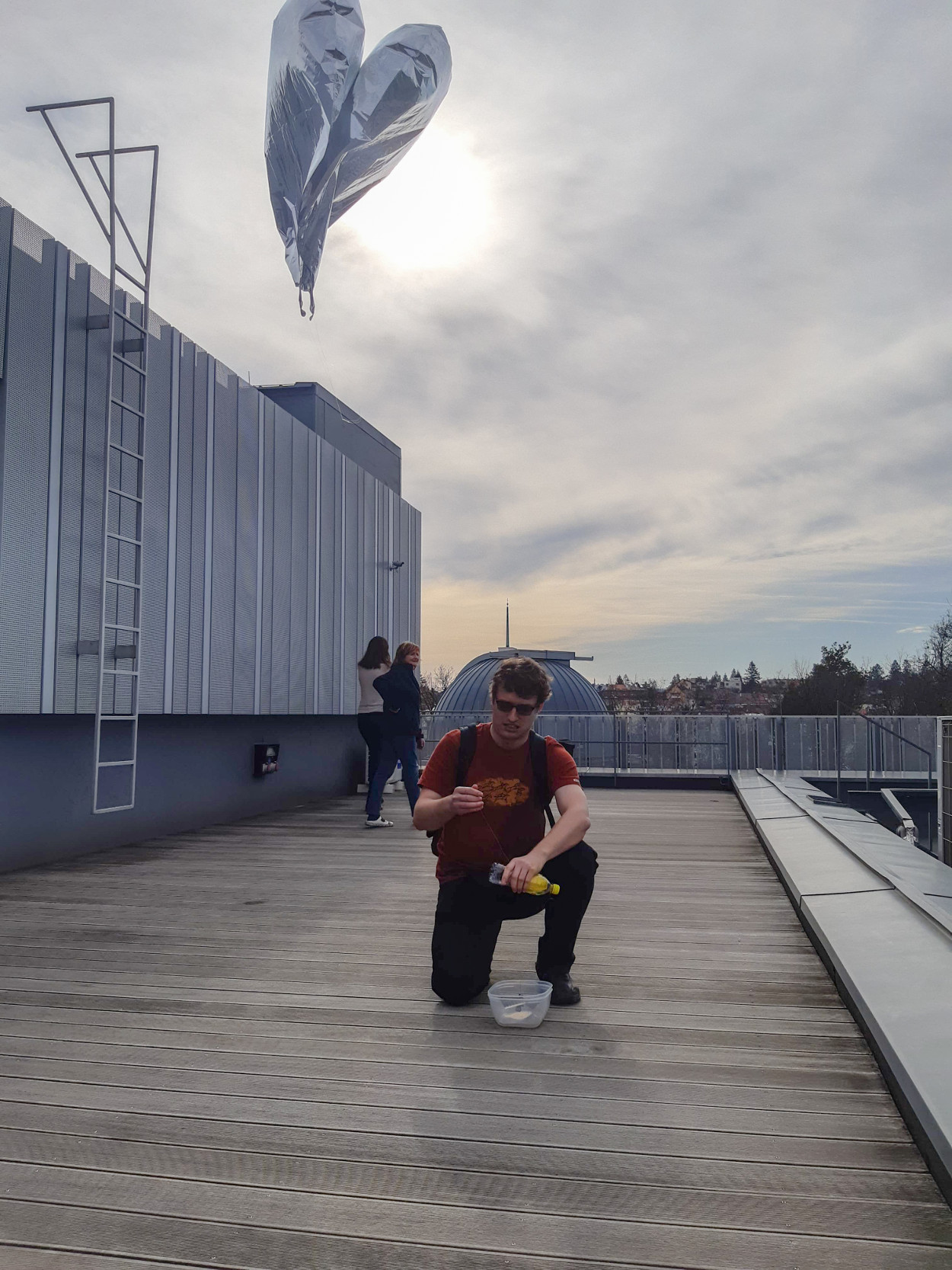 I finished both firmware and soldering at 10AM when some of the teams were probably at the observatory. I arrived at 12 o'clock. The official start (launch) was at 1PM. We were given some instructions, balloons with helium and we could go for launch. It was actually much more difficult than I expected due to the wind speed. I managed to break my antenna during the first attempt. Fortunately, Ondra (OK1CDJ) was very kind and lent me his soldering station, so I could fix that. I checked that everything worked and launched the balloon. I must say, it was a very stressfull launch. The radiosonde nearly hit a tree, hit a roof (unfortunately not as nearly :)) and finally gained some height.
