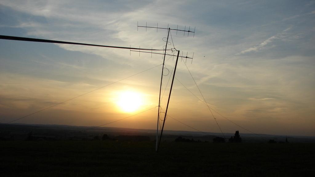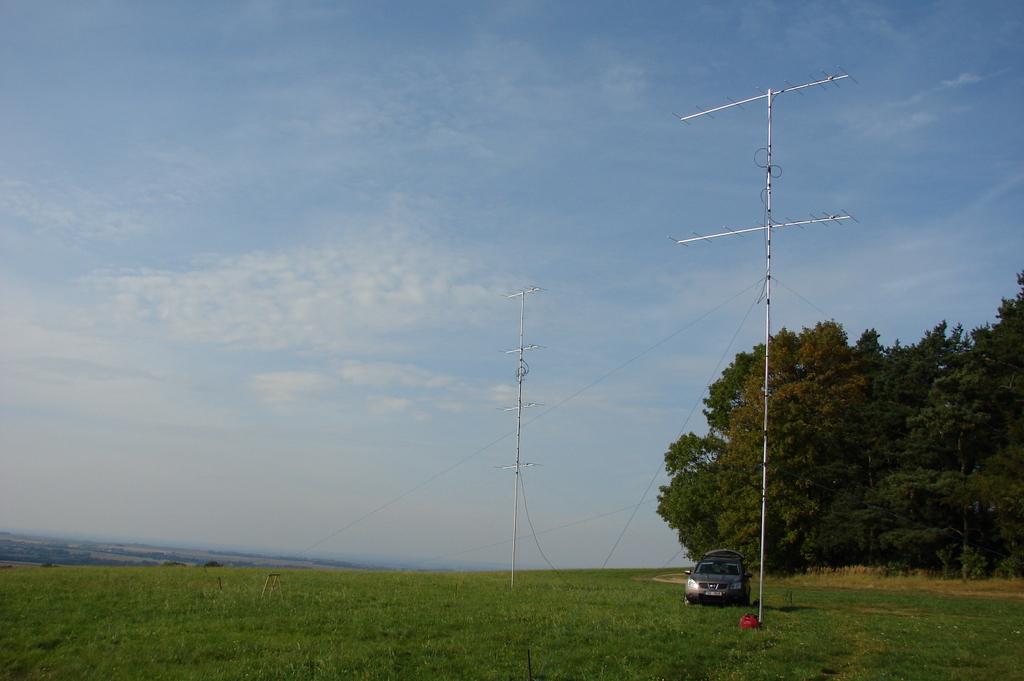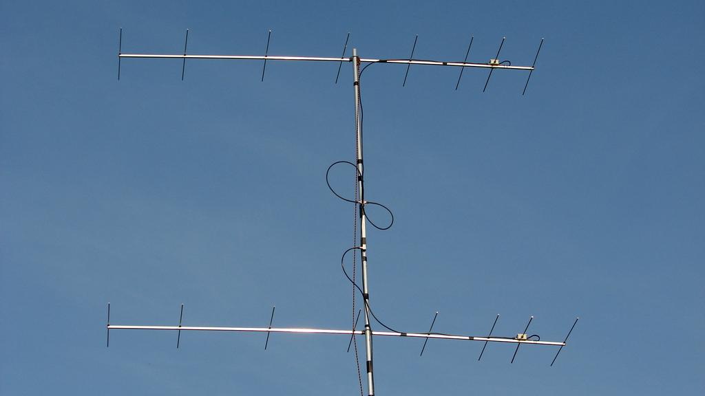 2) 2x8 element Yagi (Boom 4.35 m, 28 Ohm, radiator 12 mm, parasitic elements 10 mm, 12dBd) + power splitter, stacking distance 3.2 m