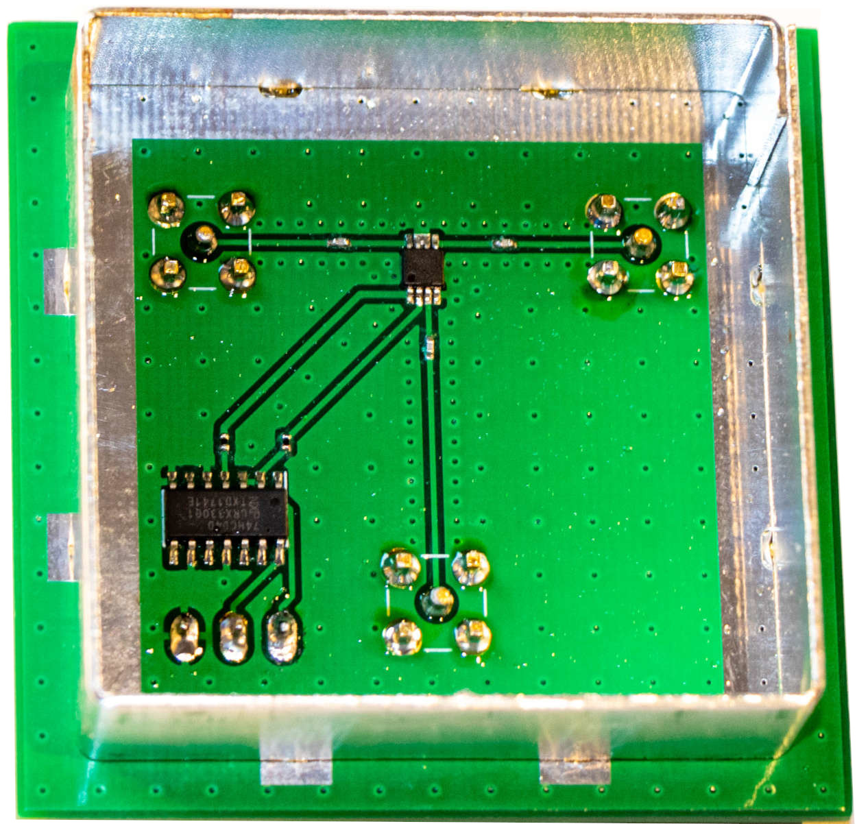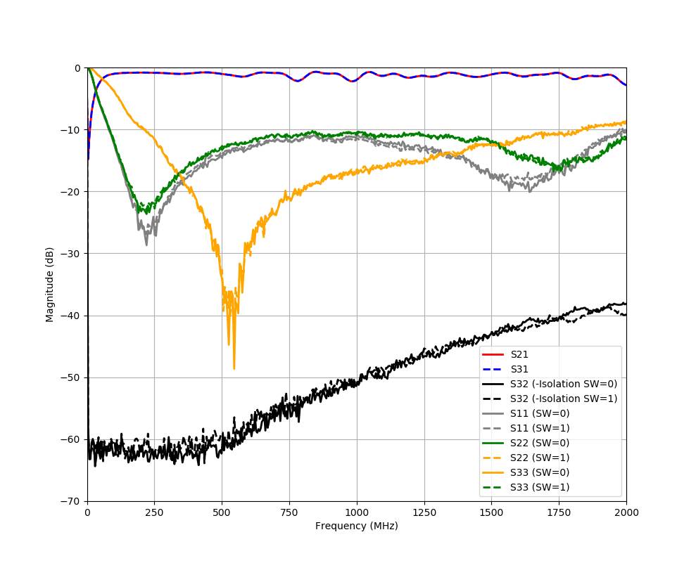 In this project, I wanted to design an RF switch that I could use for low power switching, especially at intermediate frequencies. Solid-state switches have several benefits in comparison with electromechanical switches such as better reliability, longer lifetime, resistance to mechanical vibrations and shocks, and they allow fast switching. On the other hand, solid-state switches have greater parasitic resistance, so they have higher insertion loss. Good quality mechanical relays can be very expensive therefore this could be a good alternative for some projects. My first proptotype can be seen in the following pictures. I chose a non-reflective DC to 4 GHz GaAs MESFET SPDT switch (HMC435AMS8GE). Soldering of the package (HMSOP-8) was a bit challenging and I had to use a microscope for it. The switch is connected to the SMA connectors through blocking capacitors (100pF, 0402 package). Based on the measurement I found that there is better impedance matching needed between the SMA connector and the coplanar waveguide, so it will be improved in my future design.