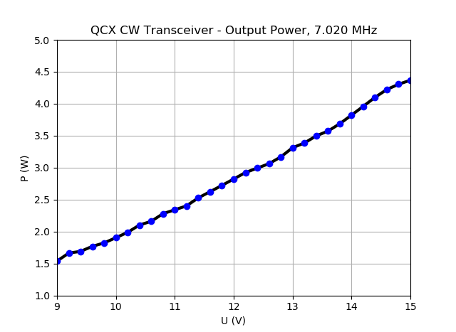 I have performed a quick measurement of the output power measuring the pak-to-peak voltage across a 50-Ohm dummy load. The results can be seen in the following figure. From the practical point of view when the transceiver is used on battery power, the output power is 2 - 3 W, so a good antenna is needed. :)